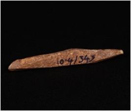| Description / विवरण | A bone point with pointed ends and brownish smooth surface. |