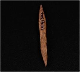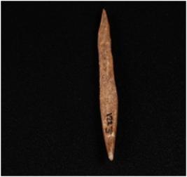 | Description / विवरण | A bone point with pointed ends, brownish smooth surface. |