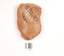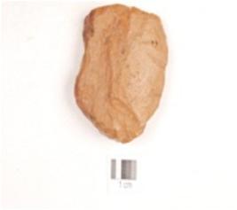 | Description / विवरण | Flake made on chert, prepared platform, prominent bulb and irregular retouched edge. |