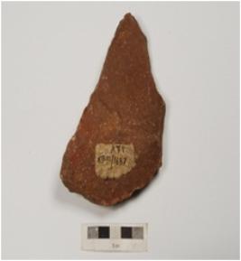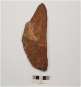 | Description / विवरण | A side scraper made on quartzite flake, flake scars on dorsal side, prepared platform, diffused bulb on ventral side, retouched mark along cutting edges and broken along distal end. |