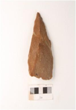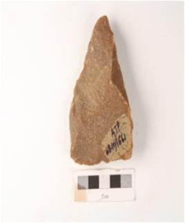 | Description / विवरण | a quartzite scraper, end struck, with a positive bulb on ventral and a ridge on dorsal side and retouches on working edge. |