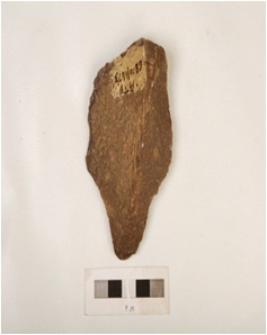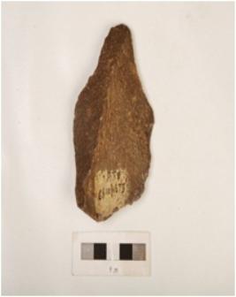 | Description / विवरण | A side scraper made on quartzite end struck flake with flake scars on dorsal side, prepared platform, diffused bulb on ventral side and retouched edge. |