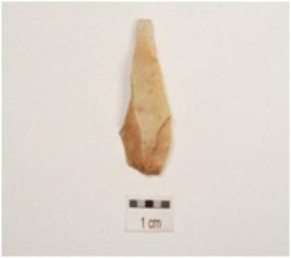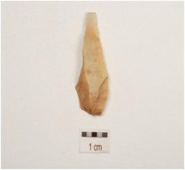 | Description / विवरण | Chert blade with a ridge on dorsal side, striking platfrom diffused bulb on ventral side, broken along at distal end and use wear marks on cutting edge. |