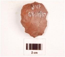 | Description / विवरण | Scraper made on chert end struck flake, irregular retouched edge, prepared platfrom, prominent bulb and plano-convex cross section. |