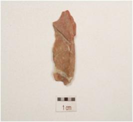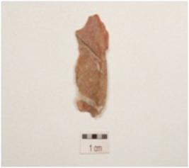 | Description / विवरण | Chert blade with a ridge on dorsal side striking platform diffused bulb on ventral side, partly broken along at distal end and use wear marks on uneven cutting edges. |