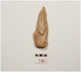 | Description / विवरण | Chert blade with two ridges on dorsal side, prepared platform diffused bulb on ventral side, pointed along at distal end, irregular retgular retouches on cutting edges, and partly trapezoidal in section. |