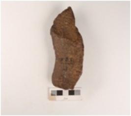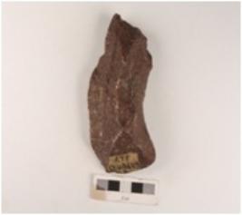 | Description / विवरण | A quartzite scraper, with concave cutting edge and ridge on a surface. |