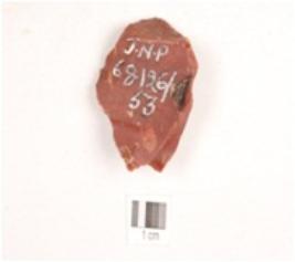 | Description / विवरण | Flake made on chert, prepared platform, bulb absent and irregular retouched edge. |