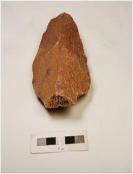 | Description / विवरण | A handaxe made on quartzite side struck flake with flake scars on both sides and irregularly retouched edges. |