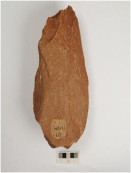 | Description / विवरण | A handaxe made on quartzite flake, flake scars on both side and retouched edges. |