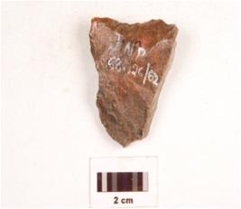 | Description / विवरण | Scraper made on chert end struck flake, flake scars on one side, irregular retouched edge and triangular cross section. |