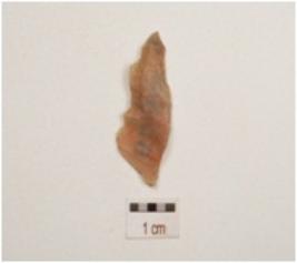 | Description / विवरण | Chalcedony blade with two ridges on dorsal side, partly broken proximal end, pointed along at distal end, use wear marks on cutting edges and trapezoidal in section. |