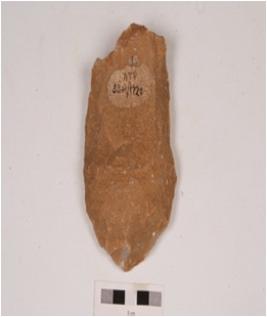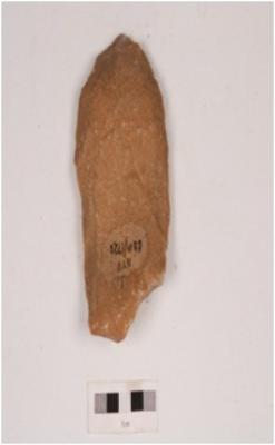 | Description / विवरण | A scraper detached from an end-struck flake with flake scars on the surface, prepared platform, diffused bulb on the ventral side and irregular retouch along the cutting edges. |