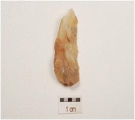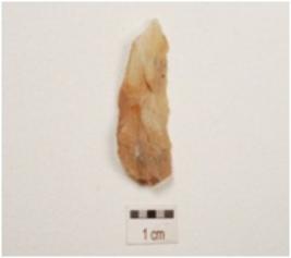 | Description / विवरण | Chalcedony blade with two ridges on dorsal side, striking platform, partly broken along at distal end, use wear marks on cutting edges, trapezoidal in section and raw material given heat treatment. |