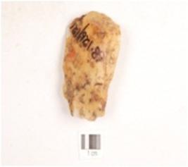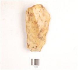 | Description / विवरण | Scraper made on chert end struck flake, prepared platform, bulb irregular retouched edge flake scars on dorsal side and triangular cross section. |