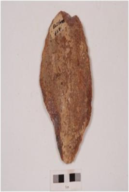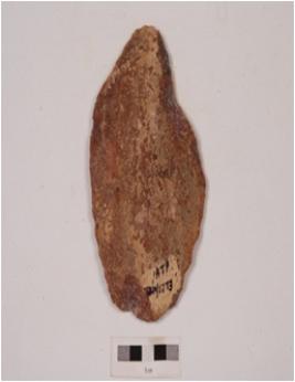 | Description / विवरण | A handaxe made on quartzite with flake scars on one side and cortex on other side and irregularly retouched edges. |