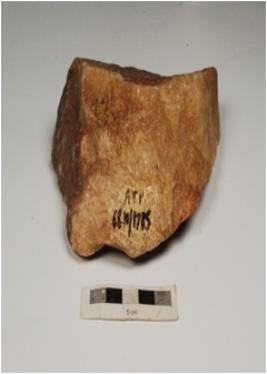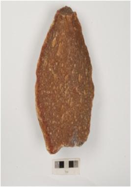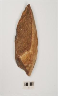 | Description / विवरण | Bifacial chopping on side struck flake, made on quartzite with cortex and flake scars on dorsal side bulb on ventral side and irregular retouches on working edge. |