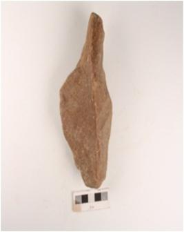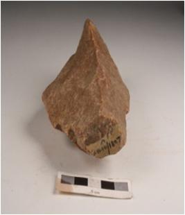 | Description / विवरण | A stone handaxe made with end-struck flake, retouching marks on edges and prepared platform. |