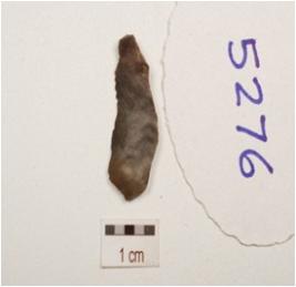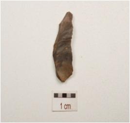 | Description / विवरण | Backed blade made on chert end struck flake, prepared striking platform on proximal end, prominent bulb on ventral surface, used wear marks on cutting edge, blunted at one side, blade scars on one side triangular in section. |