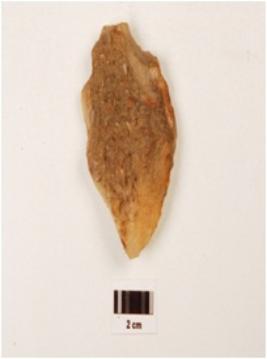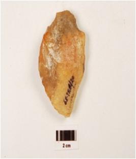 | Description / विवरण | A scraper made on chalcedony, ridge on dorsal surface, irregular cutting edges, difused bulb. |