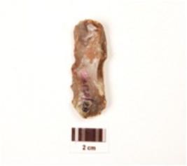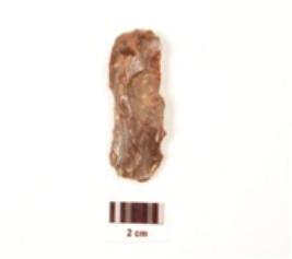 | Description / विवरण | A flake made on chert, flake marks and ridge on dorsal surface, cutting edges, difused bulb on ventral surface. |