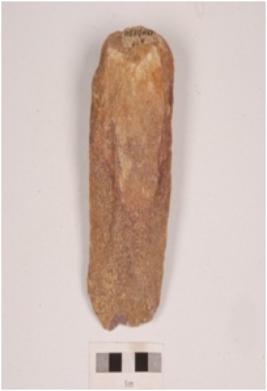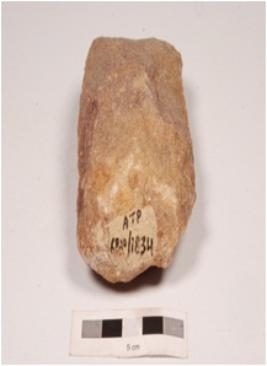 | Description / विवरण | A hand axe, made on end struck flake, prepared platform, alternate platform on both side surface and irregular retouch at cutting end. |