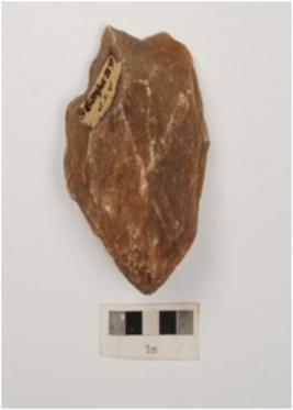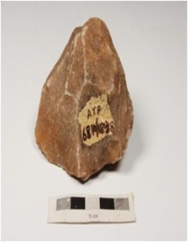 | Description / विवरण | Unifacial chopper made on quartzite with flake scars on dorsal side, bulb on ventral side and irregular retouches on working edge. |