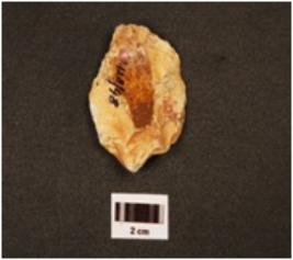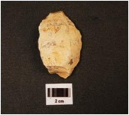 | Description / विवरण | A scraper made on chert, ridge on dorsal surface, irregular cutting edges, difused bulb. |