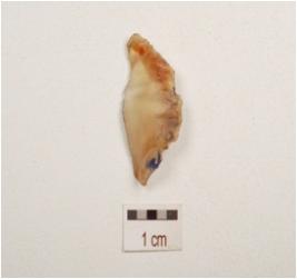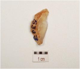 | Description / विवरण | Crescent made on chalcedony, end struck flake, platform and bulb absent, sharp cutting edge, partly broken on cutting edge, cortex on one side, used ware marks along cutting edge, triangular in section. |