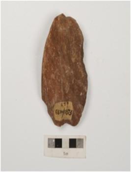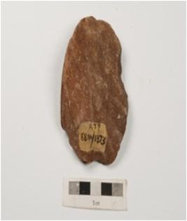 | Description / विवरण | A scraper made on a pebble, flake scars on both the sides by using soft hammer technique and regular retouched edges. |