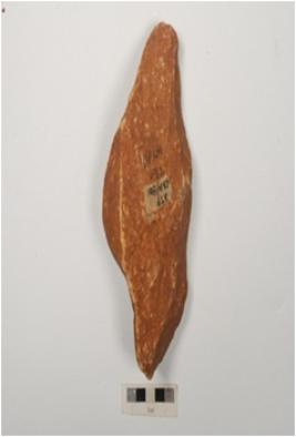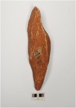 | Description / विवरण | A handaxe made on quartzite flake, flake scars on both side and retouched cutting along edges. |