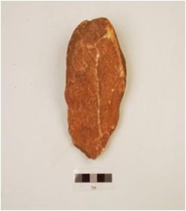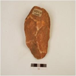 | Description / विवरण | A handaxe made on quartzite end struck flake, prepared platform, prominent bulb on ventral side, cortex partly intact on dorsal side, triangular in cross section and wavy working edge. |