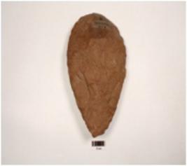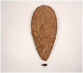 | Description / विवरण | Hand axe, made on a quartzite pebble, cortex on butt-end, sharp cutting edges forming pointed end and flake scars on both sides. |