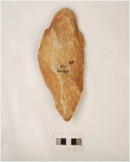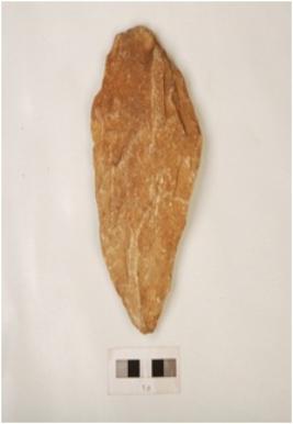 | Description / विवरण | A handaxe made on quartzite with flake scars on both sides and irregularly rectouched edges. |