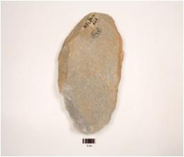 | Description / विवरण | Hand Axe, made on an end-struck quartzite flake, prominent bulb on ventral side, flake scars on dorsal side and sharp cutting edges along the lateral edges. |