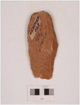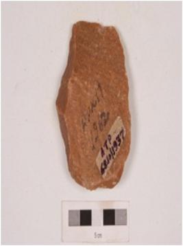 | Description / विवरण | A side scraper made on quartzite end struck flake with flake scars on dorsal side, diffused bulb on ventral side and retouched edges. |