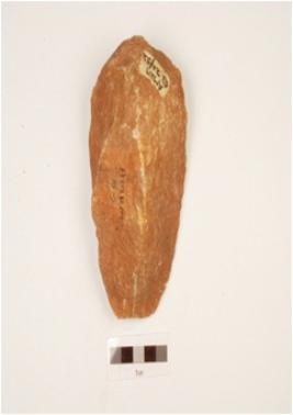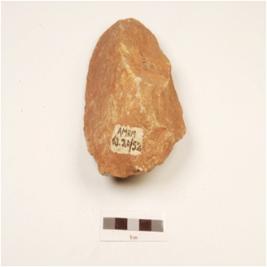 | Description / विवरण | A handaxe made on quartzite end struck flake, prominent bulb on ventral side, prepared platform, triangular in cross section, wavy cutting edge and partly intact cortex. |