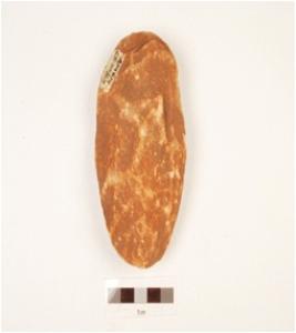 | Description / विवरण | A handaxe made on sandstone pebble with flake scars on both side, bi-convex in corss section and slightly pointed end broken. |