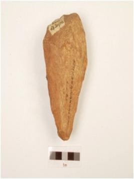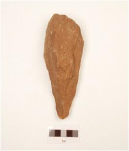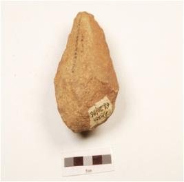 | Description / विवरण | A handaxe made on quartzite end struck flake, triangualr in cross section, wavy working edge and flake scars on both sides. |
