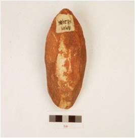 | Description / विवरण | A handaxe made on sandstone pebble with flake scars and bi-convex in cross section. |