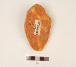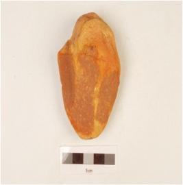 | Description / विवरण | A miniature handaxe made on sandstone pebble, flake scars on both sides, bi-convex in cross section and weathered surface. |