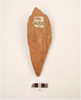| Description / विवरण | A handaxe made on quartzite side struck flake, diffused bulb on ventral side, cortex partly intact on one side, flake scars on both side, triangular in cross section. |