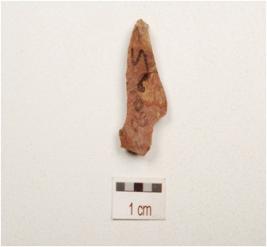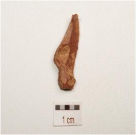 | Description / विवरण | Flake made on end struck flake, prepared platform on proximal end, blade scars on dorsal side and bulb on ventral side, use wear marks on woriking edges, triangular in section. |