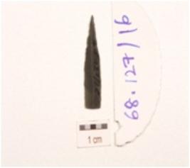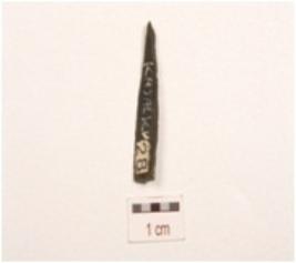 | Description / विवरण | Fragment of chert point, use wear marks along cutting edges, pointed distal end, prominent ridge on dorsal surface and triangular cross section. |