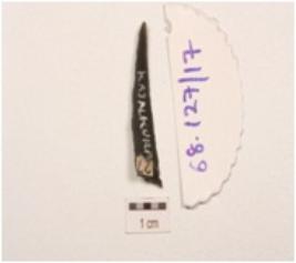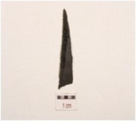 | Description / विवरण | Fragment of backed blade, made on chert, use wear marks along cutting edges, a prominent ridge on surface and triangular cross section. |