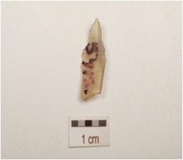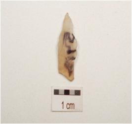 | Description / विवरण | Blade made on chalcedony diffused bulb on ventral side, use wear marks on working edges. |