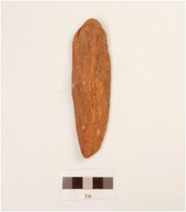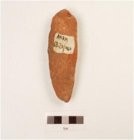 | Description / विवरण | A scraper made on quartzite end struck flake, triangular in cross section, prepared platform, prominent bulb on ventral side and flake scars on dorsal side. |