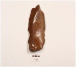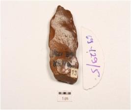 | Description / विवरण | Side-scraper, made on end struck chert flake, prominent bulb on ventral surface, irregular retouches along cutting edges, flake scars on dorsal surface and prepared platform. |