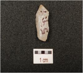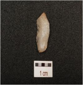 | Description / विवरण | A Flake made on end struck flake, blade scars on side, bulb on ventral side, use wear marks on working edges. |