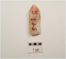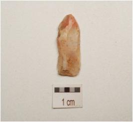 | Description / विवरण | Blade made on chert, prepared platform on posterior end and single ridge on the dorsal side, bulb on ventral side, use wear marks on working edges, triangular in section. |